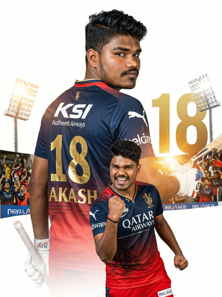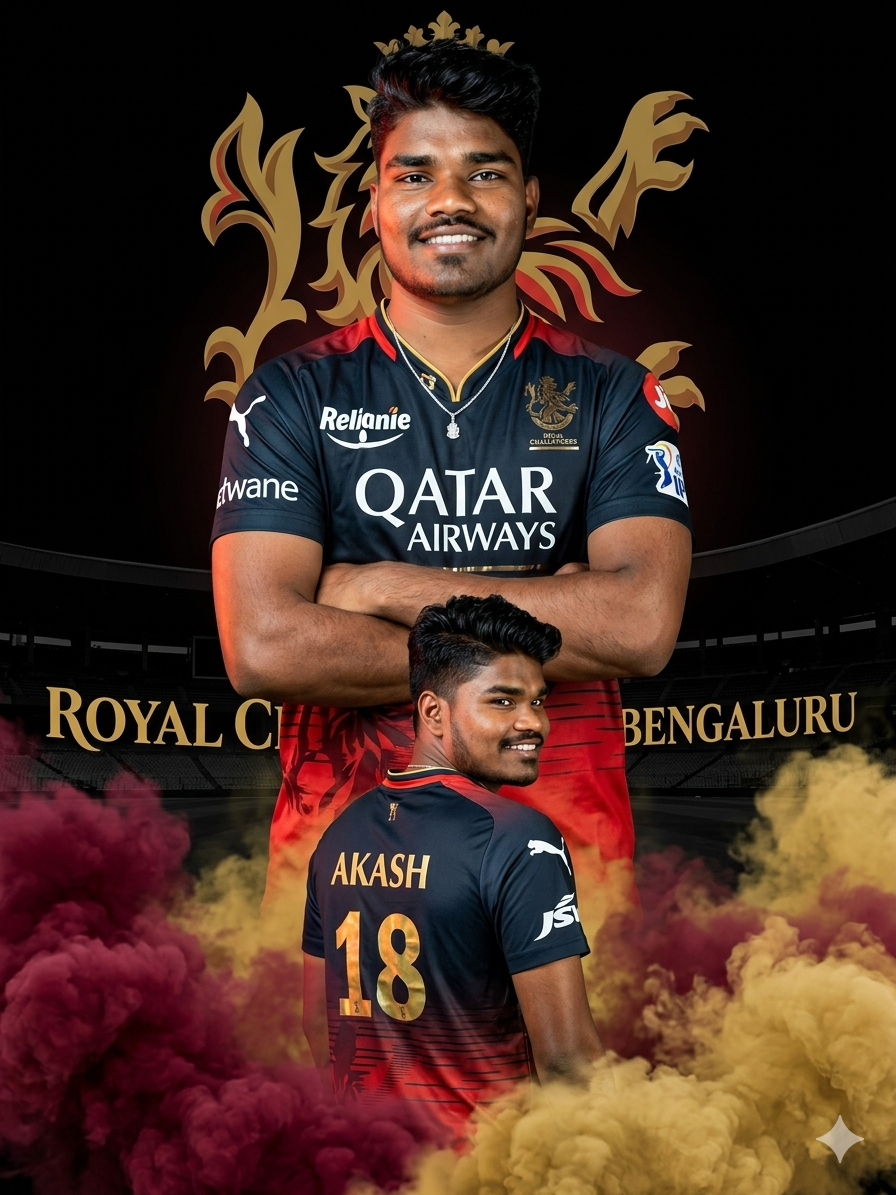 Create a hyper- realistic IPL-style poster using my photo. Keep my facial features exactly the same as in my photo but put me in a ROYAL CHALLENGEERS BANGALORE style jersey, in 2025 style, with sponsor logos in white on the chest and sleeves. Make two versions of me: one large portrait from the chest up with arms crossed and a confident smile in the center, and one back-body image of me below wearing a RCB jersey with golden colour 18 AKASH smiling,surrounded by MARRON smoke at the bottom. Use a dark black background with a large Royal challengers Bangalore logo in background (logo is given in image 2). In text golden ‘Royal Challengers Bangalore’ stadium silhouette behind me, similar to a cricket team emblem. Use vivid, high-contrast lighting to make my face and jersey stand out. Make the overall style sharp, colorful and suitable for a sports poster.