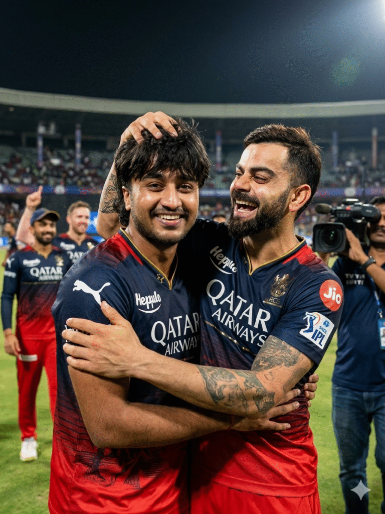 polland 18 years old young man celebrating an IPL match victory. Kohli, on the right, is laughing joyfully-and playfully messing up a young man hair while hugging him. A young man with dark shaggy hair, is smiling brightly. Both are wearing the navy blue and red Royal Challengers Bangalore (RCB) jersey with the; Qatar Airways logo visible and looking towards the camera.