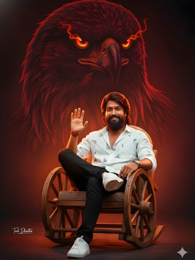 The background features a massive red and black artistic Egale head illustration with glowing eyes, symbolizing strength and power. Subtle warm ambient lighting highlights the man's face and clothes, while soft orange and red light gradients illuminate the scene from behind, creating depth and atmosphere.
