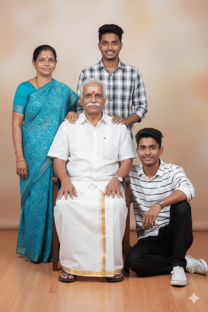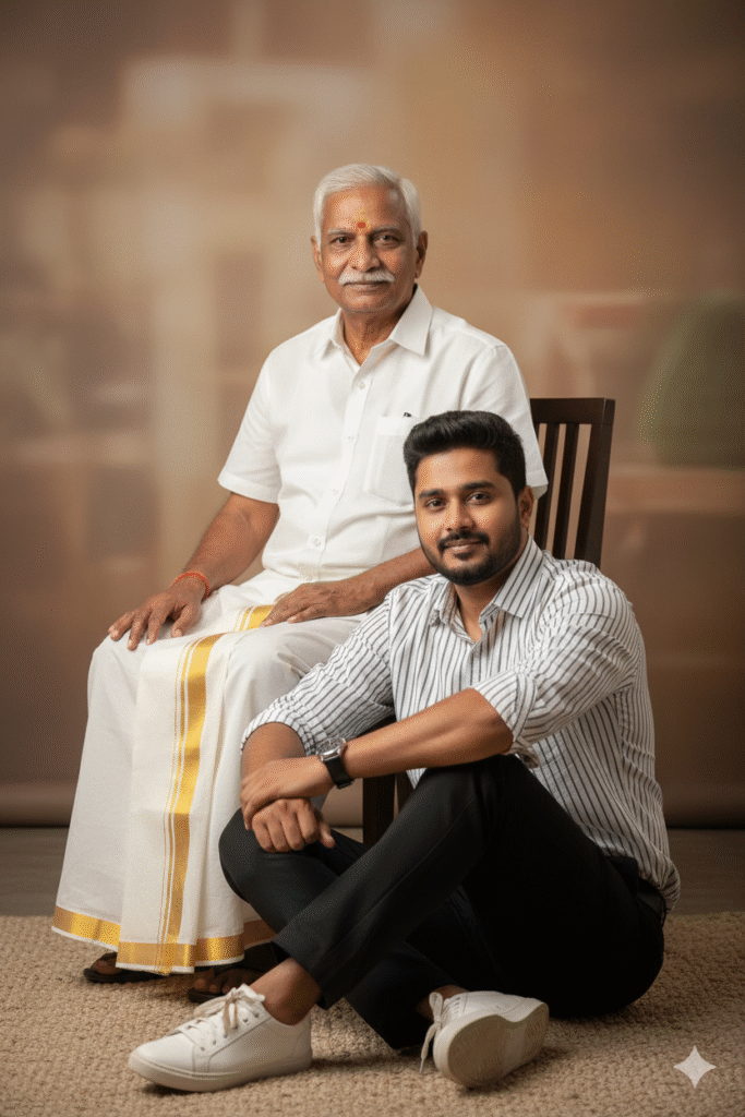 4K ultra-realistic retro-style portrait inspired by Devar Magan.Use uploaded real face for both father and son (100% accurate facial match).Father sits calmly on a classic wooden chair, wearing traditional white veshti and white shirt, sandals on his feet, dignified posture, calm expression.Son stands confidently on the left side with folded arms, wearing a half-sleeve white shirt tucked into black pants, black shoes, proud stance, strong personality.Background shows a rustic South Indian Chettinad mansion interior with carved wooden pillars, antique temple-style wooden doors, earthy stone floor, authentic 90s South Indian ambience.Warm dramatic cinematic lighting with subtle shadow falloff, rich film-like color grading, vintage 90s Indian cinema tones, high dynamic range.Sharp textures, realistic skin tones, film-grain effect, atmospheric depth.Image ratio: 4:3.