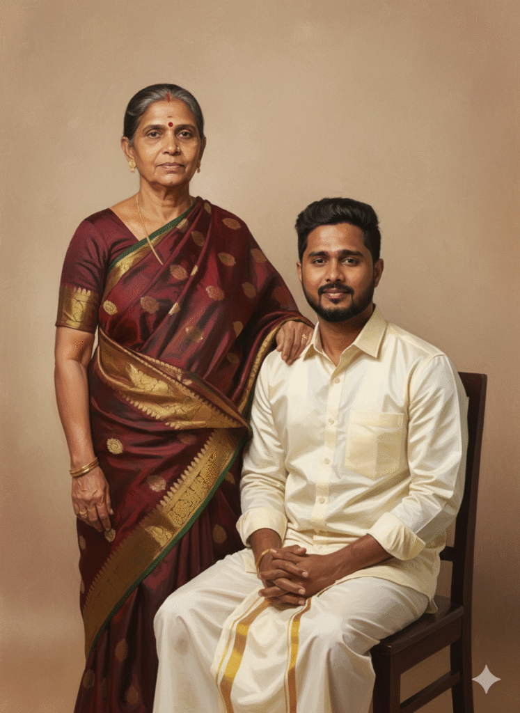 I am giving two photos, one of me (male) and one of my mother (female). Please generate a realistic portrait of us together in a studio-like setting. Use both photos exactly as uploaded keep the facial looks, expressions, and structures 100% the same, without any changes (shoot mom photo and my photo exactly as provided). High-detail, editorial photography style, 4K. Make my mother stand beside me, wearing a traditional saree with elegant patterns, simple jewelry, and a calm expression. Position me sitting on a chair in front of her, wearing a shirt and dhoti with a border design. Ensure she has one hand gently resting on my shoulder, showing